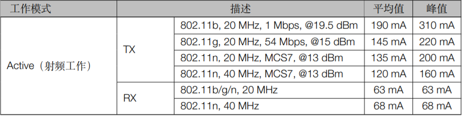 功耗(测试环境:3.3V供电,25℃环境温度):