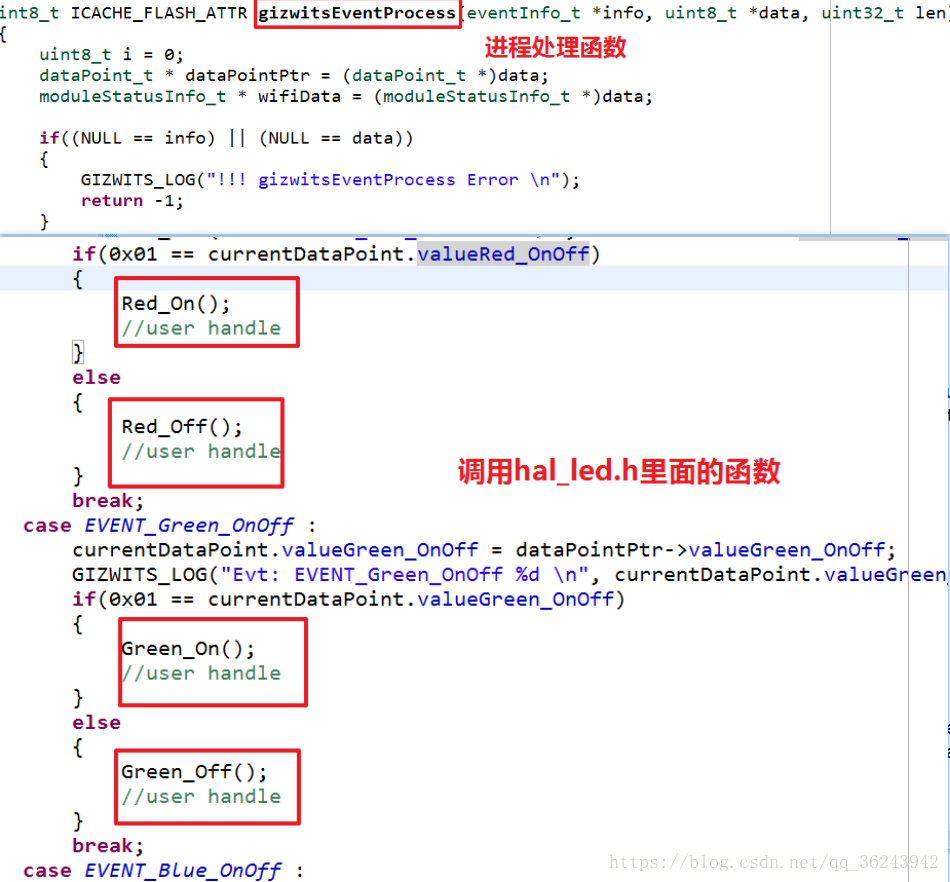 最后一步是在(下载文件名)appGizwits里的gizwits_product.c文件中添加逻辑控制程序,本例就是ESP8266收到机智云平日套APP的对应指令后执行开或关灯动作。