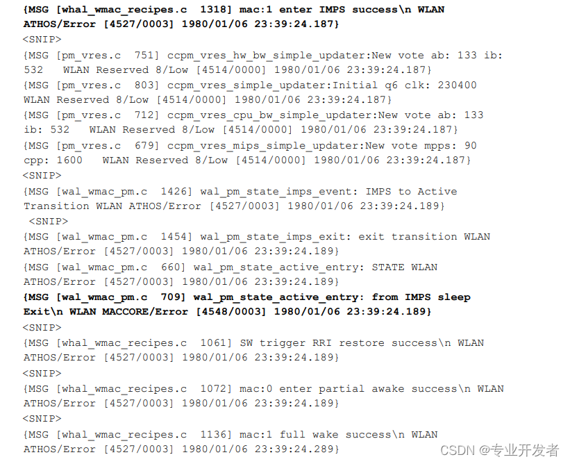 IMPS日志在下面以粗体打印。 WLAN固件打印WLAN电源状态转换的日志。