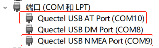 模块装上gps天线,使用usb线连接电脑。安装模块usb驱动,成功后打开设备管理器,可以看见模块虚拟了3个串口。主要使用到AT和NMEA两个串口(本设备为COM10和COM9)。