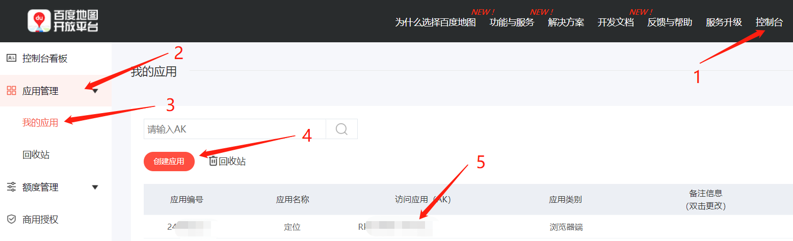 使用百度地图API应先在百度地图开发平台注册为开发者,然后进入控制台,创建一个应用,得到密钥(AK)。