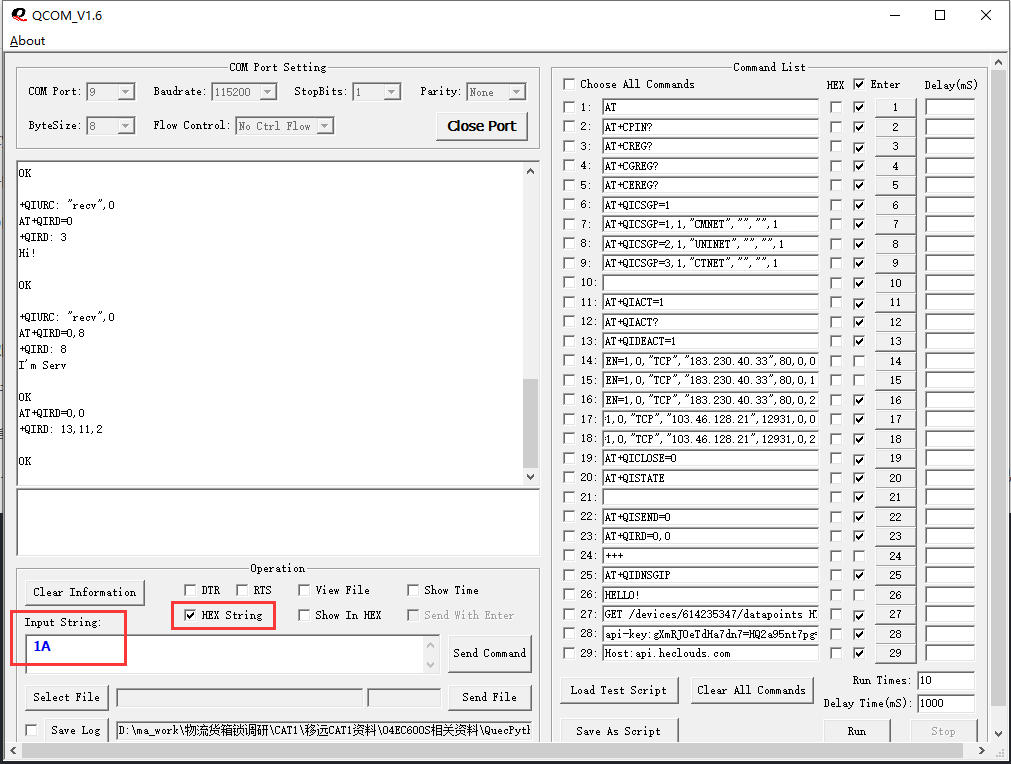 Ctrl + z 发送按不出来怎么办?:(QCOM上按不出来不要慌,左下角勾选上HEX,输入Ctrl+z对应的ASC2码 1A,可实现一样的效果)
