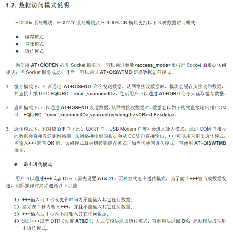 透传模式:如果用过ESP8266的AT或者蓝牙透传模块,那这个就很好理解了。不需要任何指令,串口发送什么网络就传输什么。在透传模式下,发送 "+++" 退出透传输入模式,回到指令模式。