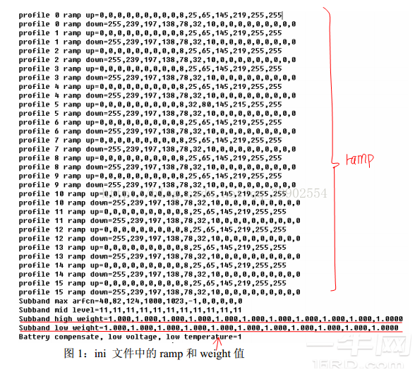 射频调试包括发送和接收两个大的方面, 其中发送又包括了发送功率、相位误差、 PVT、开关谱、调制谱调试等,接收包括灵敏度、 RXloss、接收电平等。在开始调试之前必须明确手机的各种射频参数的状态。怎样明确手机射频状态:先对手机进行校准,校准的初始化文件一定要使用mtk 提供的原始文件(见图 1),这样才能明确手机的匹配状态,比如在全频段功率是否平坦(如果加权了就看不出来), TC 和 PA 之间的匹配是否做好了(如果改变了 Ramp 曲线的值就不好判断)。以 GSM 900M 为例 1 信道、 62 信道、 124信道输出功率如果相差 0.5dBm 以上,那么 PA 输出匹配和 TC 与 PA 的匹配就没有做好,这个时候如果开关谱和相位误差很好,那么就只需要调 PA 输出匹配就可以了(注意输出匹配有可能会影响相位误差),如果开关谱和相位误差很差,那么就一定要先调好 TC 和 PA 之间的匹配,再去调 PA 输出匹配。开关谱的判断标准:在高功率等级下至少有 7dB 的余量,小功率等级下要有 10-15dB 以上的余量,尤其需要注意的是+/-0.4MHz 和+/-0.6MHz 的余量。相位误差的判断标准: GSM 都能做到 RMS 1° 左右, DCS 在 2° 左右;同样要做到全频段相位误差相差不能太大。