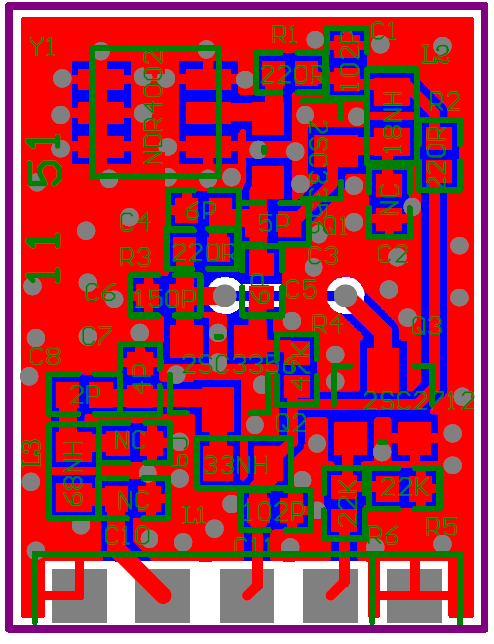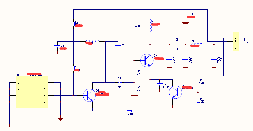 Y1是谐振器,Q1是放大器,C3决定功率(C3容值越大,功率越大)L2与C2构成振荡器(用于调节频偏),R1对功率影响最大。