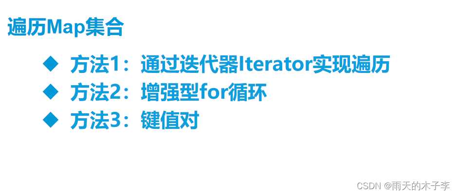 (2)遍历HashMap集合时可以遍历键集和值集,有for循环遍历、增强for循环遍历和迭代器(Iterator接口)遍历三种方式。