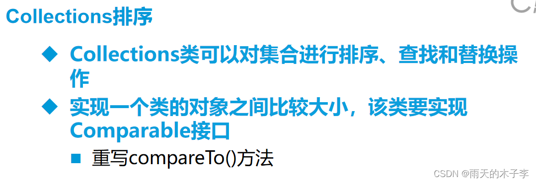 (1)排序是针对集合的一个常见需求。要排序就要知道两个元素哪个大哪个小。在Java中,如果要实现一个类的对象之间比较大小,那么这个类就要实现Comparable接口。