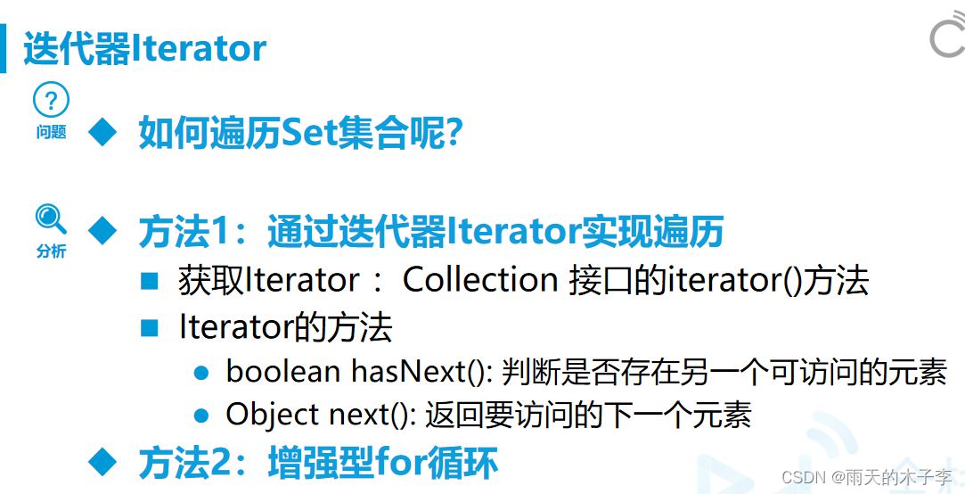 (1)Iterator接口表示对集合进行迭代的迭代器。Iterator接口为集合而生,专门实现集合的遍历。