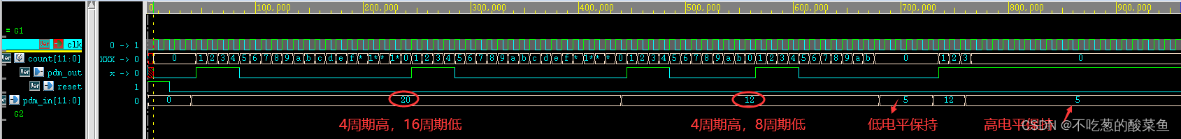 从波形中可以看到我们设置了pdm_in = 20,pdm_out如我们所想,输出为占空比4/20的方波。当设置pdm_in = 12时,pdm_out输出为占空比4/12的方波。当设置pdm_in < 10时,dpm_out保持原来的状态不变。