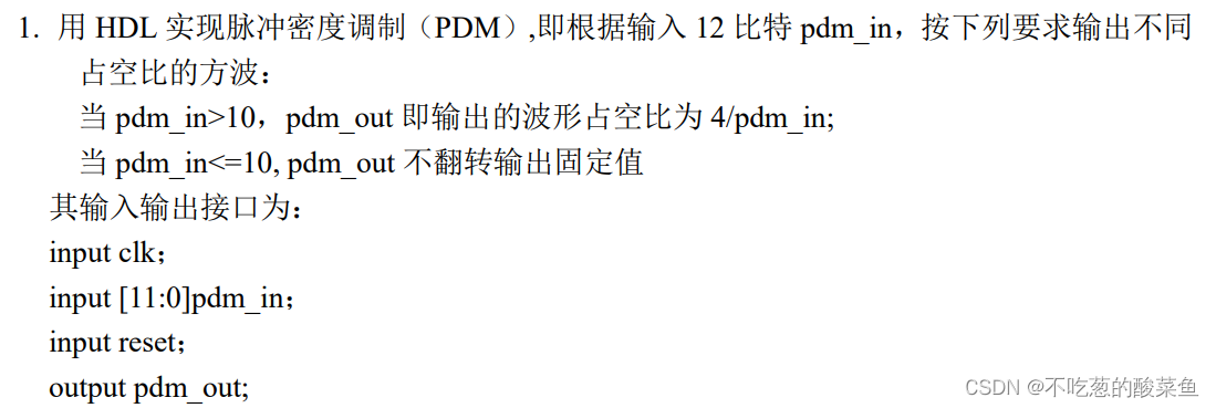 使用HDL实现脉冲密度调制(PDM),即根据输入12bit pdm_in,按下列要求输出不同占空比的方波: