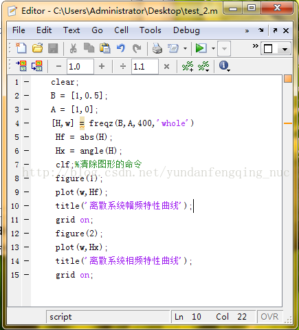 B和A分别为离散系统的系统函数的分子、分母多项式的系数向量,N为正整数,返回向量H则包含了离散系统频响在0-PI范围内N个频率等分点的值,向量w则包含0-PI范围内N个频率等分点。调用中若N默认,默认值为512。