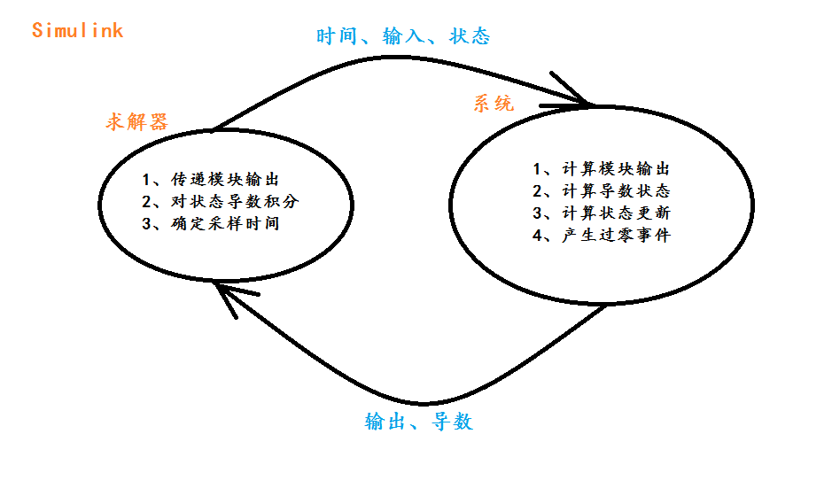 Simulnk仿真分为两步:初始化、仿真循环。仿真是由求解器控制的,求解器主要作用是:计算模块输出、更新模块离散状态、计算连续状态。求解器传递给系统的信息包括:时间、输入和当前状态。系统的作用:计算模块的输出、更新状态、计算状态导数,然后将这些信息传递给求解器。求解器和系统之间的信息传递是通过不同标志来控制的。