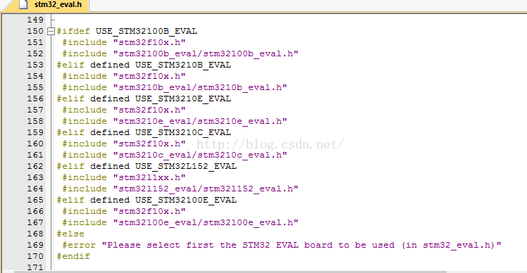 刚刚没有这样的错误提示,并且根据main.c文件中对eval的定义可知在包含了eval的头文件后,还需要选择对应的评估板。打开stm32_eval.h文件: