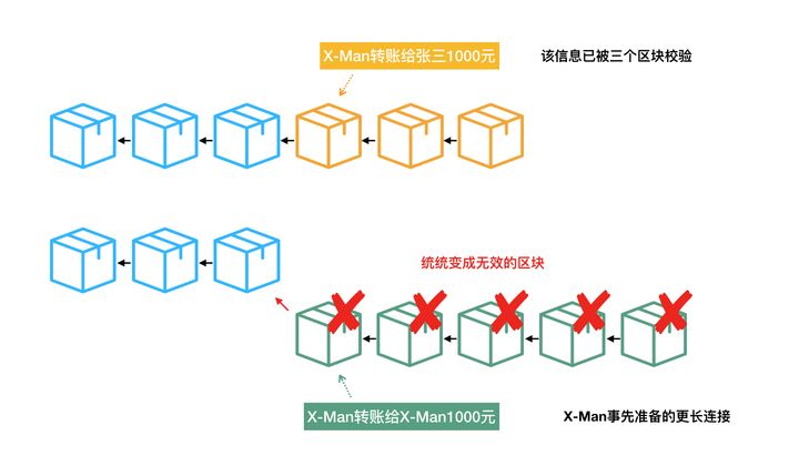 - 大功告成,X-Man拥有了一条更长的区块链条,那些较短、存放着“X-Man转账给张三1000元”的区块链,以及在区块链世界里那则真实转账行为被一同成功销毁。(???)