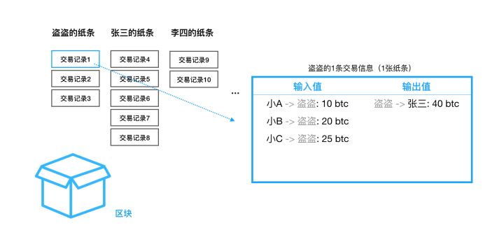 - 发起交易的时候,发起人会收到一张小纸条,他需要将交易记录比如说“盗盗转账给张三40元”写在纸上。说来也神奇,当写完的那一刹那,在小纸条的背面会自动将这段交易记录格式化成至少包含了“输入值”和“输出值”这两个重要字段;“输入值”用于记录数字货币的有效来源,“输出值”记录着数字货币发往的对象。