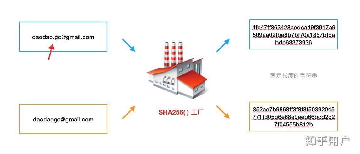 第一个知识点:SHA256()函数。你只需要知道,任意长度的字符串、甚至文件体本身经过SHA256函数工厂的加工,都会输出一个固定长度的字符串;同时,输入的字符串或者文件稍微做一丢丢的改动,SHA256() 函数给出的输出结果都将发生翻天覆地的改变。注意,SHA256()函数是公开的,任何人都能使用。