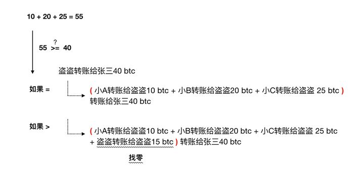 就上图例子来说,我们最后合并成的交易记录 “( 小A转账给盗盗10 btc + 小B转账给盗盗20 btc + 小C转账给盗盗 25 btc + 盗盗转账给盗盗15 btc ) 转账给张三40 btc ” 事实上等同于“盗盗转账给张三40 btc”。其中“盗盗转账给盗盗15 btc”就可以理解找零。