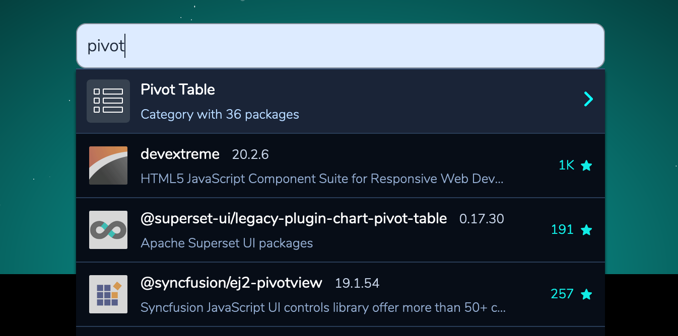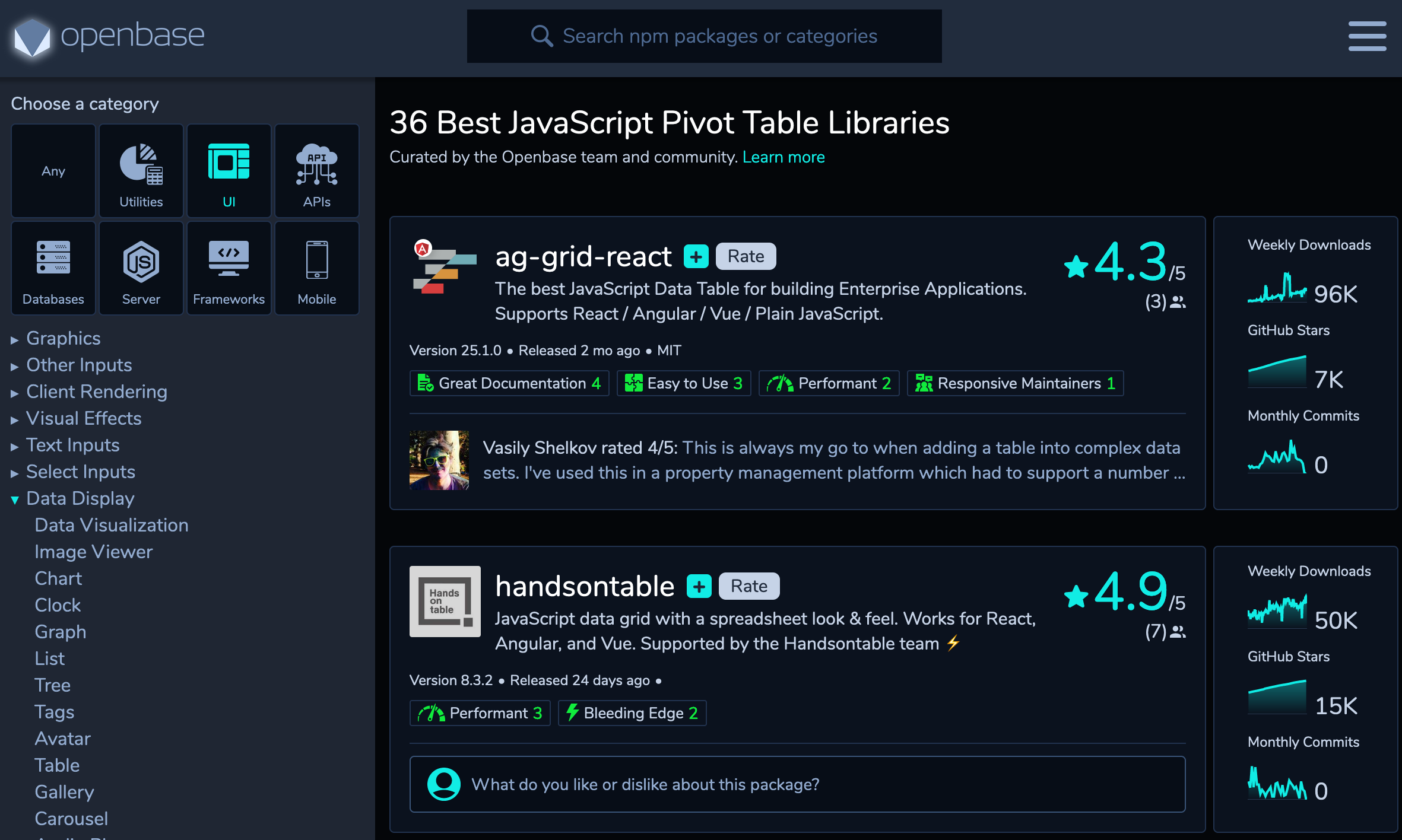 进入这个分类,我发现了新大陆!Openbase 直接帮我检索出了 36 个最佳的 JavaScript 数据透视表库!