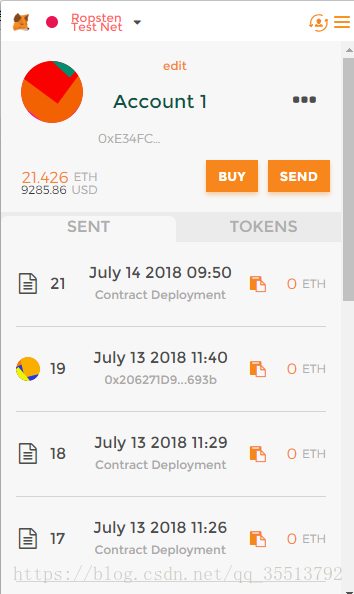 打开metamask后按着流程新建账户以后,左上角就有选择网络的选项,这里选择的是ropsten网络,如果需要获得这个测试网络的以太币,你只需要点击BUY,然后按着提示就可以申请测试链的以太币