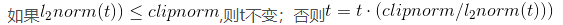 其作用在于将传入的梯度张量t的L2范数进行了上限约束,约束值即为clip_norm,如果t的L2范数超过了clip_norm,则变换为t * clip_norm / l2norm(t),如此一来,变换后的t的L2范数便小于等于clip_norm了。