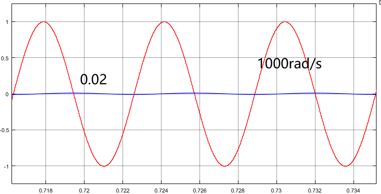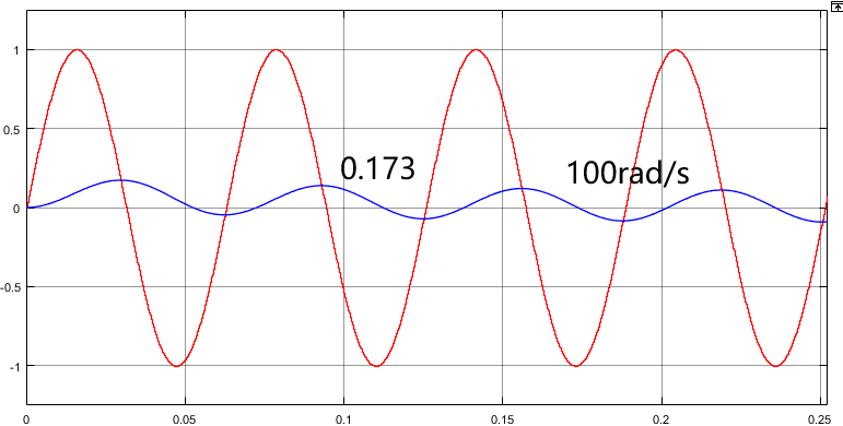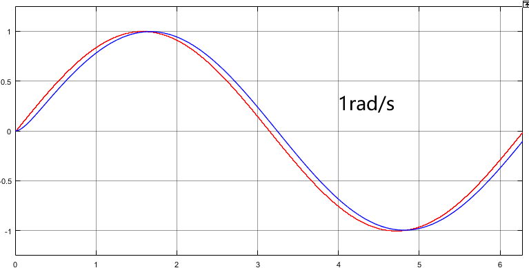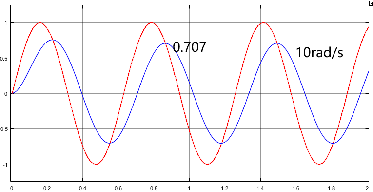 我们具体的看看不同频率的输入在经过以上一个一阶惯性环节之后的效果。如下面四张图所示,截止频率以前,1rad/s时输出信号的保真度较高,基本能够实现跟随;在截止频率10rad/s处幅值降至0.707,相位滞后45°;100rad/s时,幅值降至0.173,相位滞后将近80°;1000rad/s基本已经没有响应了。证明截止频率对输入信号的响应性能能够提供直接指标。