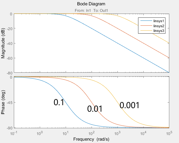 上图中一直都是按照开关增益为1来进行实验的,现在看看开环增益对相幅特性的影响。这张图蓝色的线是s系数为0.01,也就是转折频率为100的曲线,其他四个是转折频率为10的曲线。观察下图可以得到一下两个结论: