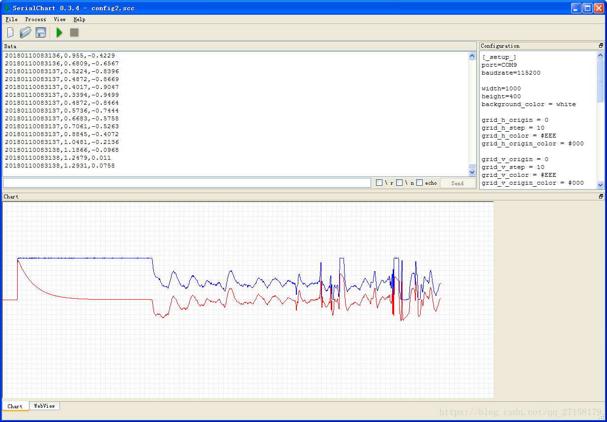 上位机使用了SerialChart-0.3.4,把信号波形显示。效果如下图。数据第一列是时间戳,第二列是原始数据,第三列是滤波后的数据。Chart中,蓝色是第二列原始数据,红色是第三列滤波后的数据。