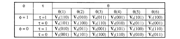 其中,第一列是指转子磁链幅值大小,1表示增大趋势,0表示减小趋势;第二列表示转矩增减趋势,同理。配合上面的电压空间矢量分布图,针对磁链的幅值和转矩增势的四种组合方式,可以给出六个扇区的电压矢量分布表,也称为逆变器的开关表。