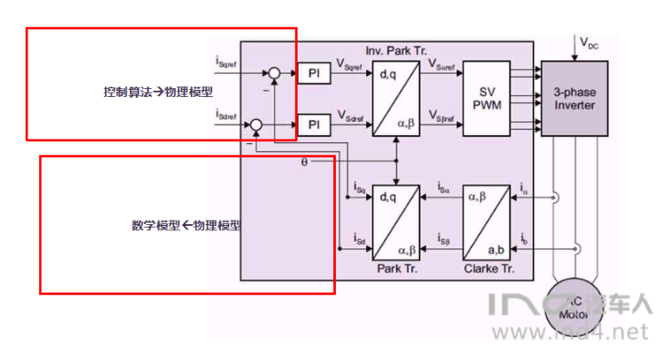 FOC的控制的基本思路就是将三相静止ABC坐标系下的相关变量转换到旋转坐标系下(d,q)进行数学运算,controller改变d轴和q轴的电压达到控制d轴和q轴电流的目的。然而最终给电机三相的只能是静止坐标系下的电压,因此在控制算法中需要再次把dq轴的电压转换成ABC三相电压给驱动桥。即存在一个从物理模型à数学模型à控制算法à物理模型的过程。