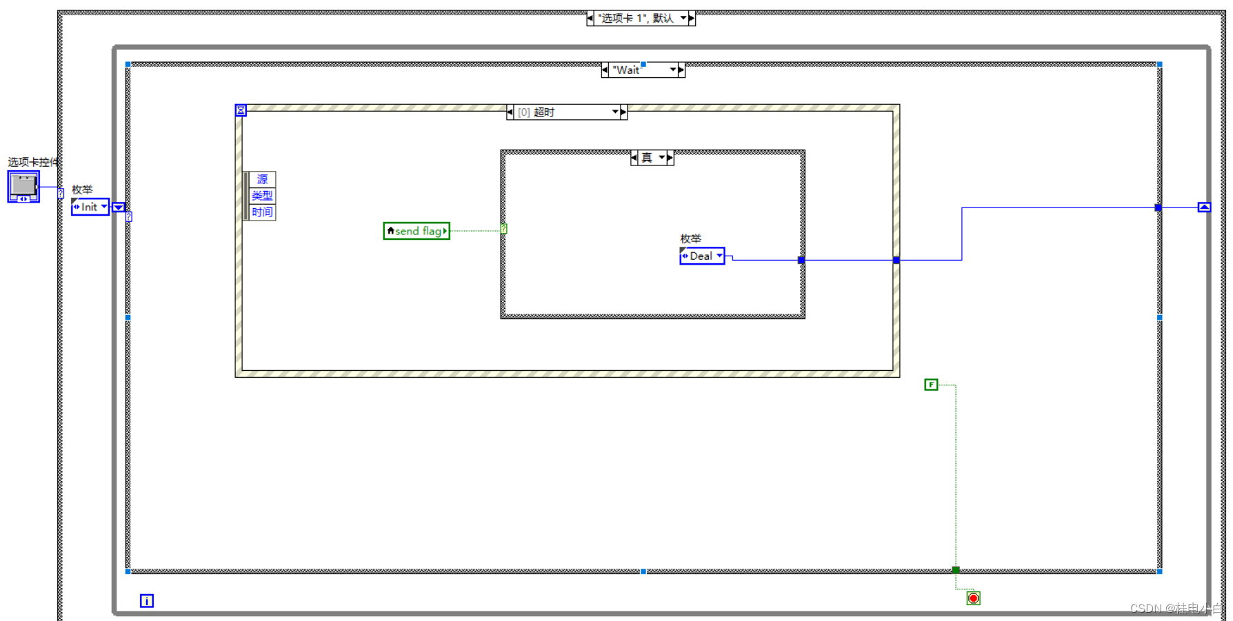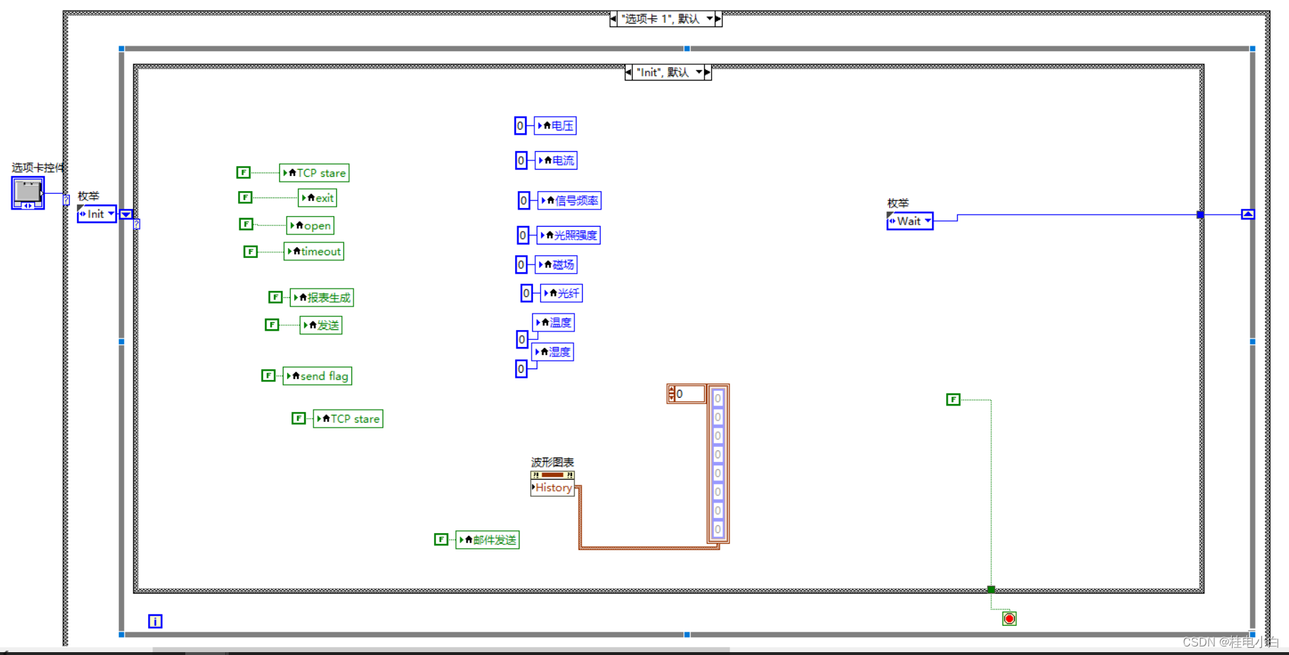 初始化主要是对于各种要使用到的变量进行初始化,还有对要显示的波形图先初始化清空,不然波形图会保留有上次运行的数据波形。初始化完以后进入“Wait”。