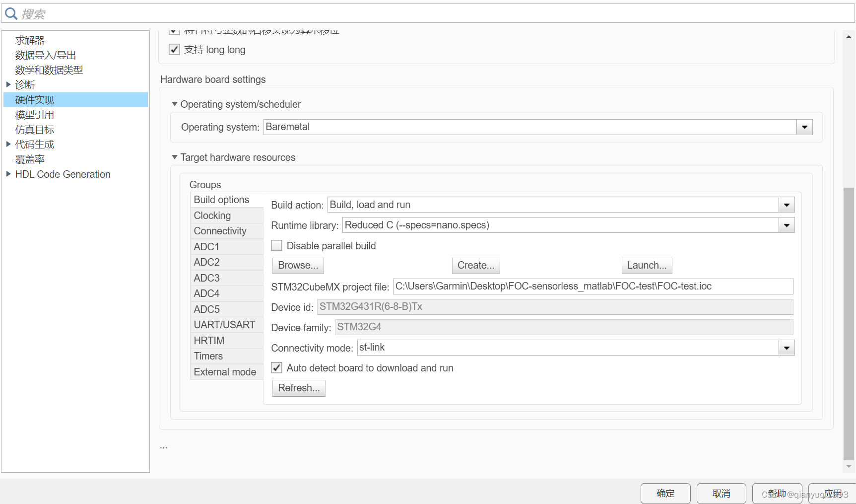 打开Simulink模板,然后Ctrl+E操作弹出硬件配置窗口,在STM32CubeMx项目文件选取上一步保存的.ioc文件。