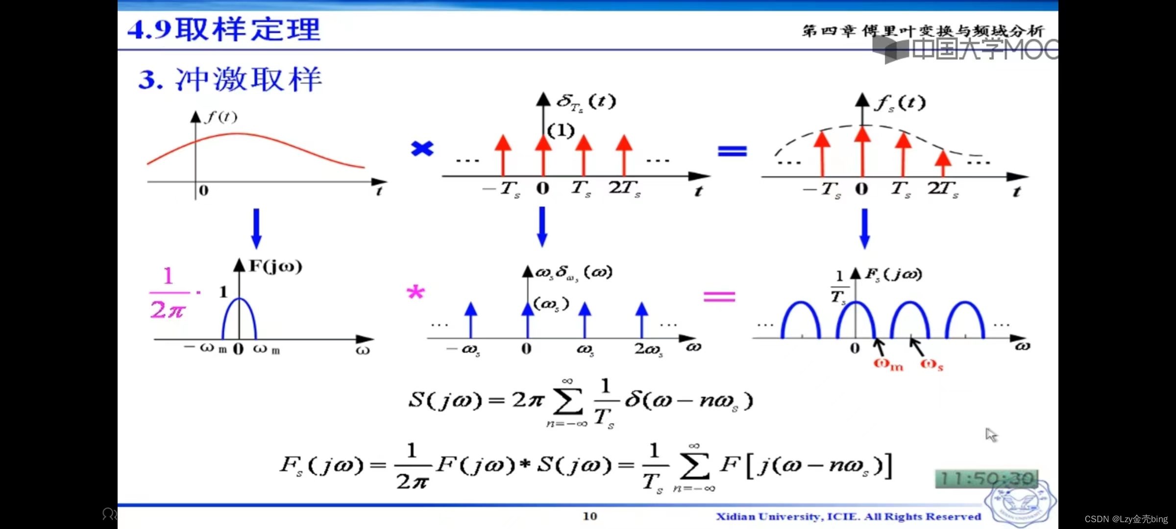 冲激采样图解:图上第一排表示在时域上,一个有限带宽的信号(原始信号)X 周期(周期为T)冲激信号 = 原始信号的离散型。第二排表示将第一排的信号从时域上傅里叶变换到频域上,再进行卷积(时域上的乘积等于频域上卷积)。最后卷积出的信号在频域上就出现了无数个周期性(周期为1/Ts)的、带宽(2ωm)相同、幅度相同的原始信号。