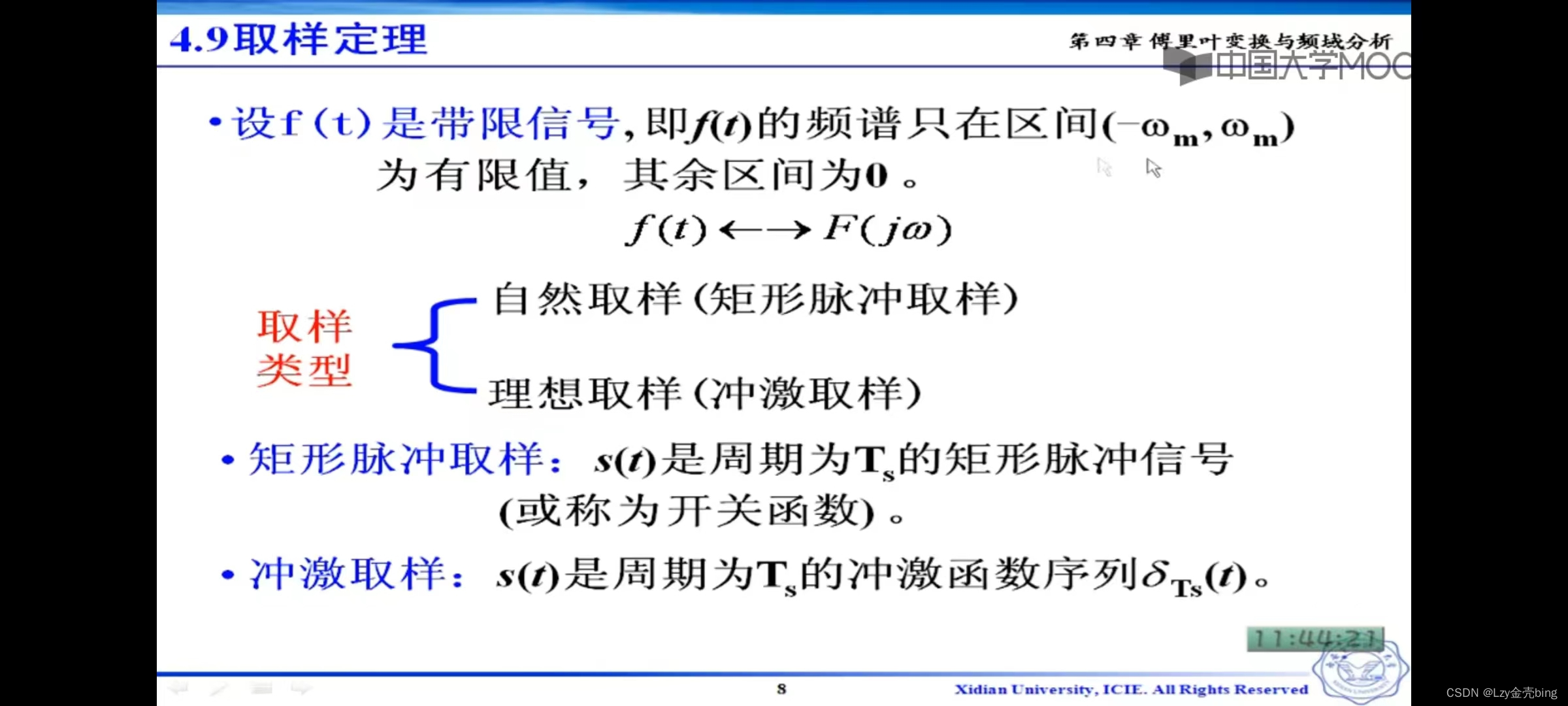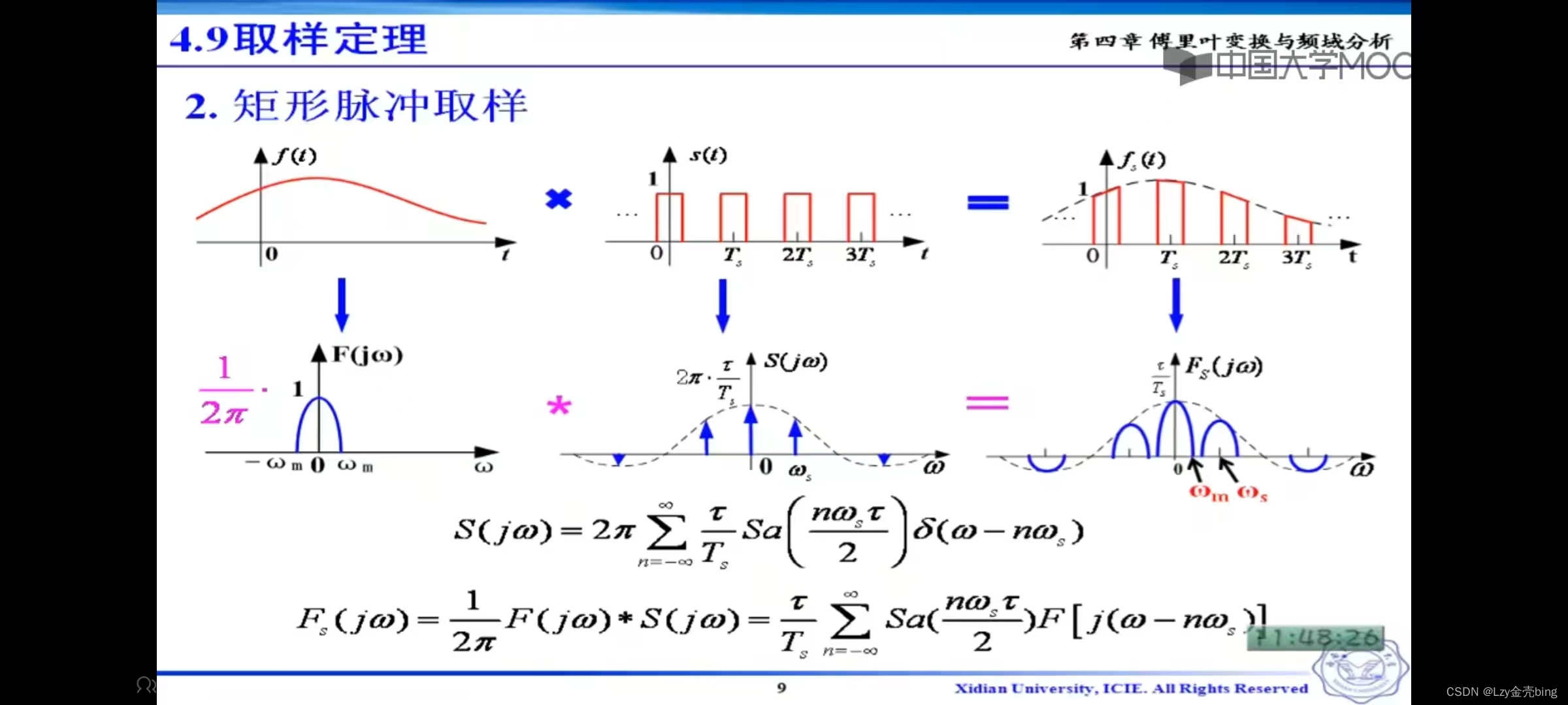 矩形脉冲采样图解:图上第一排表示在时域上,一个有限带宽的信号(原始信号)X 周期(周期为T)矩形脉冲信号 = 原始信号的离散型。第二排表示将第一排的信号从时域上傅里叶变换到频域上,再进行卷积(时域上的乘积等于频域上卷积)。最后卷积出的信号在频域上就出现了无数个周期性(周期为1/Ts)的、带宽(2ωm)相同、但是幅度不同的原始信号。