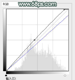 10、创建曲线调整图层,对RGB,蓝通道进行调整,参数设置如图15,确定后创建剪切蒙版,再把蒙版填充黑色,用柔边白色画笔把人物脸部擦出来,效果如图16。这一步把人物脸部调亮,并增加淡黄色。