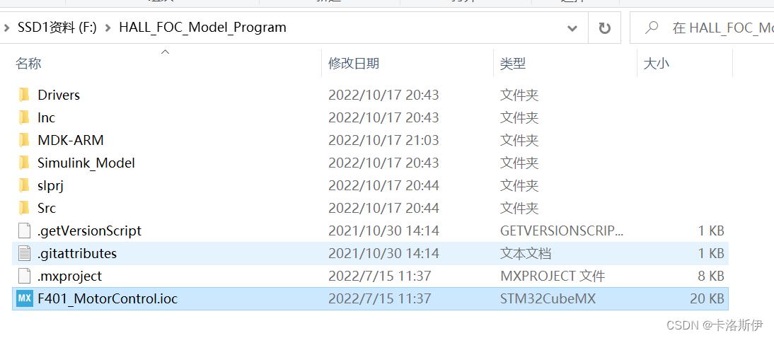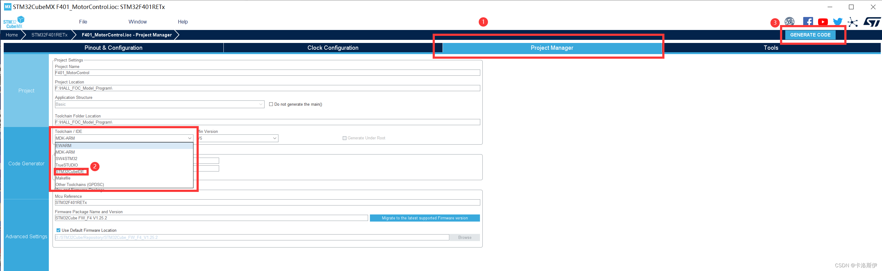 双击CubeMX的工程文件,F401_MotorControl.ioc文件,如下,直接找到Project Manager,找到Toolchain,选择CubeIDE就可以。后面直接点生成代码