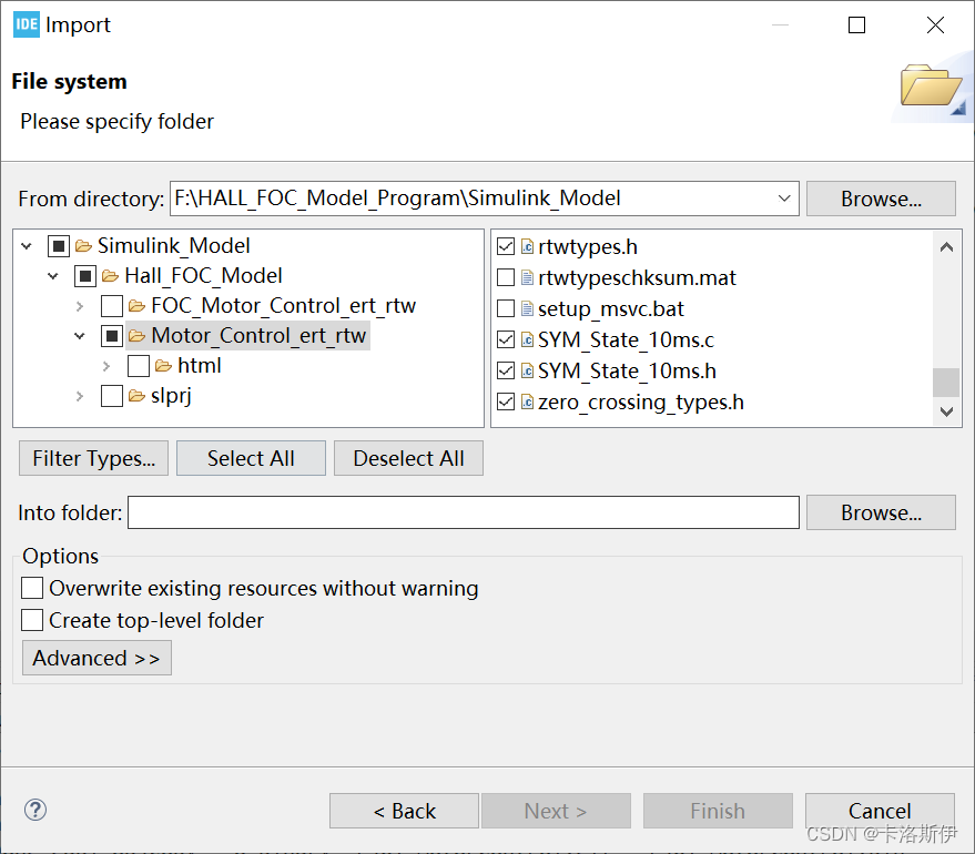 找到Simulink生成代码的文件夹,勾选.c和.h就可以了。ert_main.c这个文件不要选,这是Simulink生成的main文件,里面定义了main函数会冲突