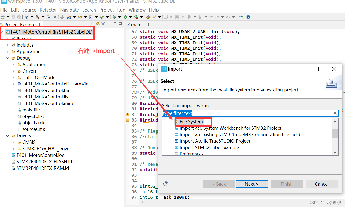 (1)添加Simulink生成代码的文件夹,在项目上右键选择导入File System
