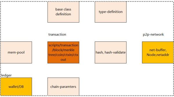 从整张图我们可以看出,比特币的模块比较少,也比较简单。chain-paramters描述了整个区块链的参数设置,wallet是与地址/加密还有存储相关的,mem-pool是未确认的交易池。得益于比特币核心开发者的不朽贡献,相比中本聪时代的比特币代码,现在的比特币代码质量已经相当不错了。