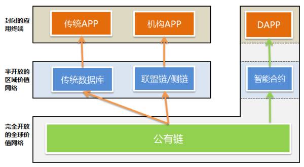 公有链提供可信可靠的价值传输网络,上面可以继续组建去中心化应用(DAPP)或者部署联盟链,甚至传统数据库都行,在上层搭建C端应用。