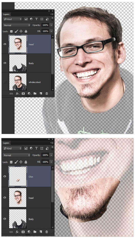 2、将头部和衣服部分进行隔离。切出人物特征的各个元素。身体和衣服层应遵循他的衬衫领口。