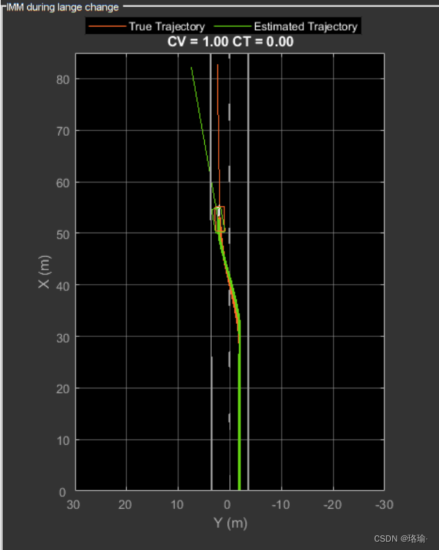 当使用检测校正筛选器时,IMM 筛选器会自动计算每个模型的概率。下面的动画显示了车道变换事件期间模型的估计轨迹和概率。