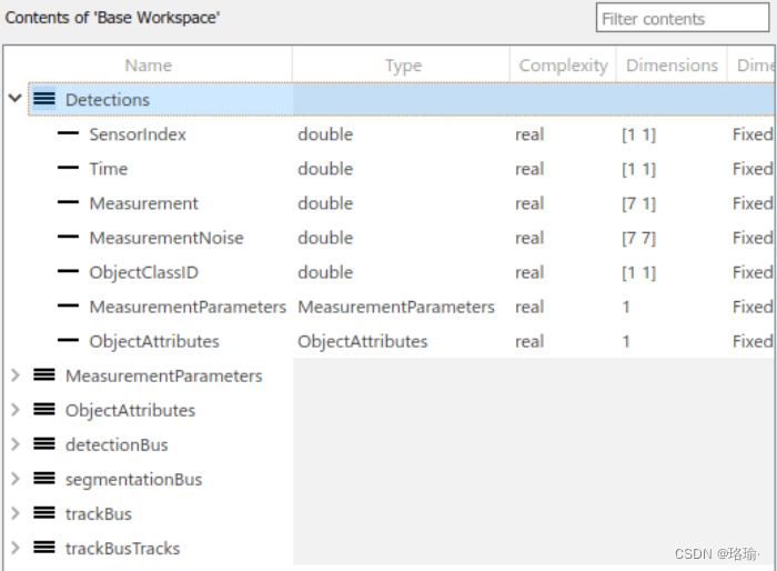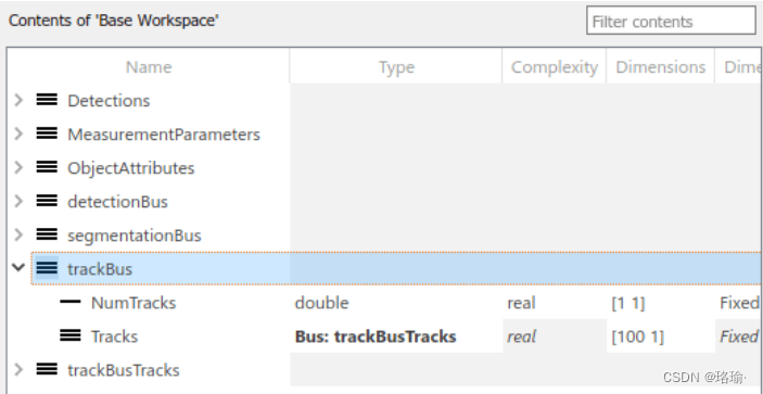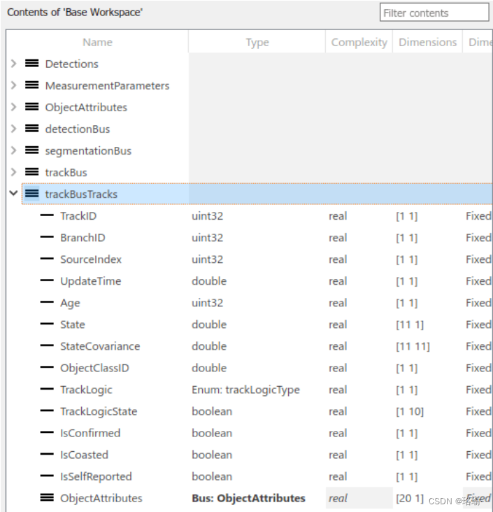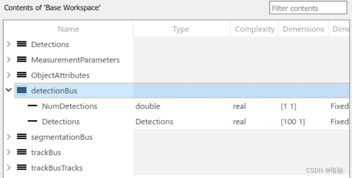 如前所述,不同模块的输入和输出由总线对象定义。您可以使用类型编辑器 (Simulink) 可视化每条总线的结构。下图显示了用于检测和跟踪的总线结构。