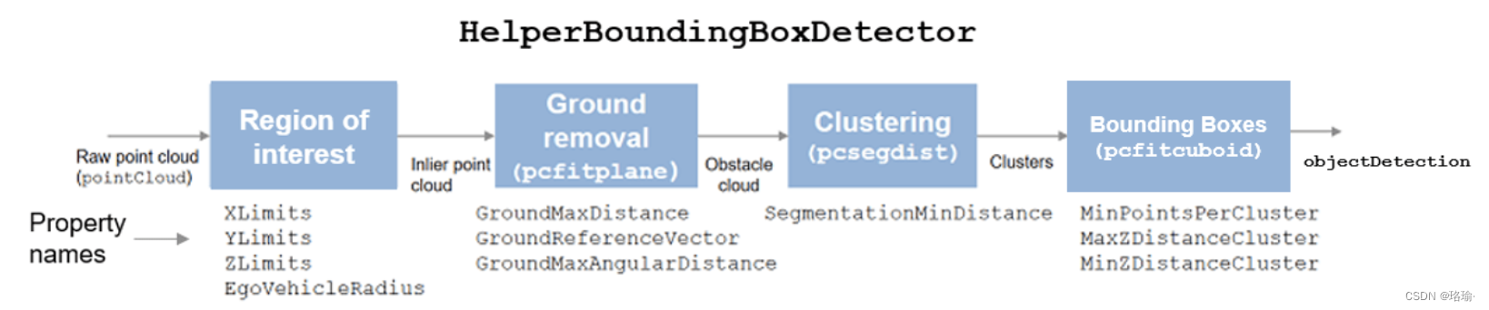 如前所述,来自传感器的原始数据包含大量点。必须预处理此原始数据以提取感兴趣的对象,例如汽车、骑自行车的人和行人。预处理是使用边界框检测器块完成的。边界盒检测器也实现为由帮助器类 定义的 MATLAB 系块。它接受点云位置作为输入,并输出与障碍物对应的边界框检测。该图显示了边界框检测器模型中涉及的过程以及用于实现每个过程的计算机视觉工具函数。它还显示控制每个进程的块的参数。