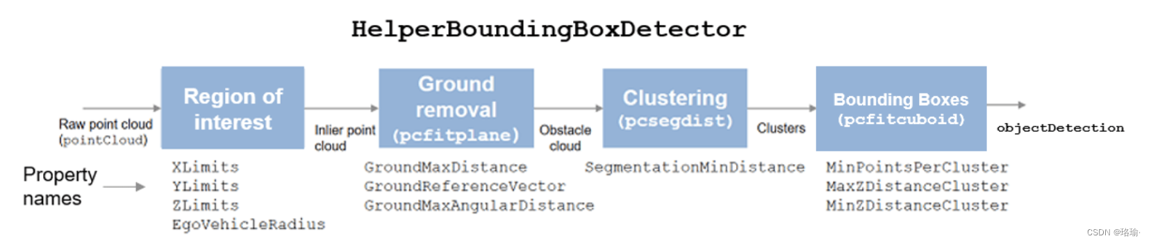 该图显示了边界框检测器模型和用于实现每个过程的激光雷达工具箱™函数中涉及的过程。它还显示控制每个进程的支持类的属性。