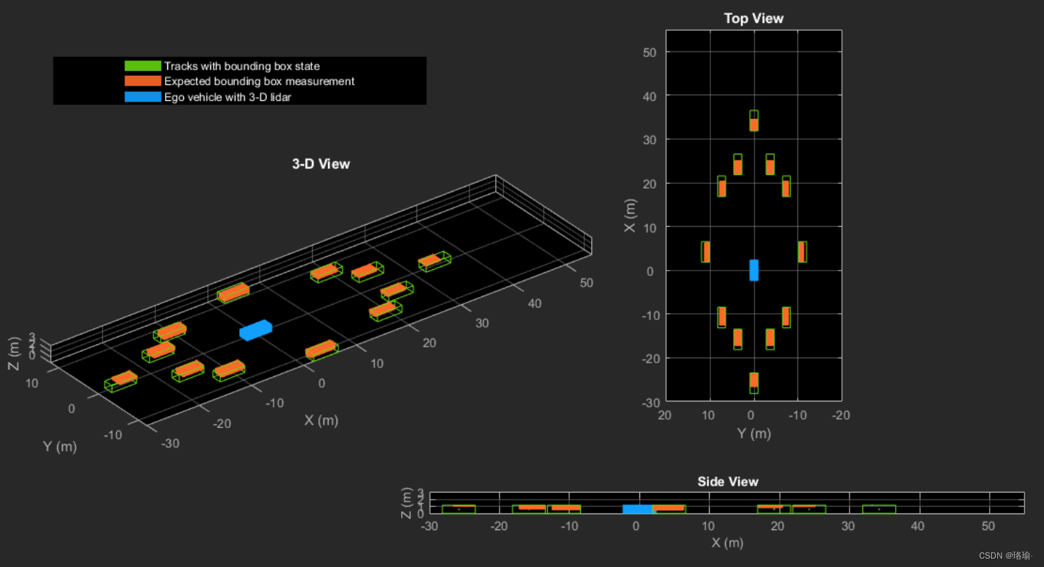 以上就是勤奋黄豆最近收集整理的关于基于Matlab使用激光雷达从点云到跟踪列表跟踪车辆仿真(附源码)一、3-D 边界盒探测器模型二、目标状态和传感器测量模型三、设置跟踪器和可视化四、循环访问数据五、结果六、总结七、程序的全部内容,更多相关基于Matlab使用激光雷达从点云到跟踪列表跟踪车辆仿真(附源码)一、3-D内容请搜索靠谱客的其他文章。