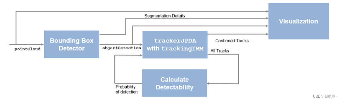 此示例显示了如何使用带有 IMM 过滤器的 JPDA 跟踪器来跟踪使用激光雷达传感器的对象。您 了解 了 如何 对 原始 点 云 进行 预 处理 以 生成 传统 跟踪 器 的 检测, 传统 跟踪 器 假定 每个 传感器 扫描 每个 对象 一 个 检测。您还学习了如何定义长方体模型来描述 JPDA 跟踪器跟踪的扩展物体的运动学、尺寸和测量值。