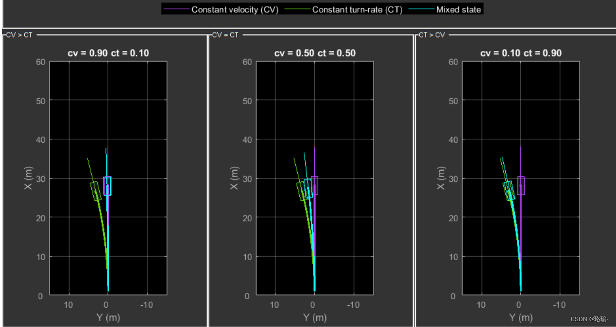 在此示例中,联合概率数据关联跟踪器 与 IMM 筛选器 结合使用来跟踪对象。IMM 滤波器使用恒定速度和恒定转弯率模型,并使用本例中包含的支持函数 进行初始化。IMM方法有助于轨道在运动模型之间切换,从而在机动或车道变换等事件中实现良好的估计精度。下面的动画显示了在IMM滤波器的预测阶段混合恒定速度和恒定转弯率模型的效果。