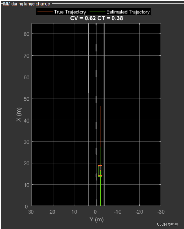 IMM 筛选器在使用来自对象的检测进行校正时更新每个模型的概率。下面的动画显示了车道变换事件期间车辆的估计轨迹以及每个模型的相应估计概率。