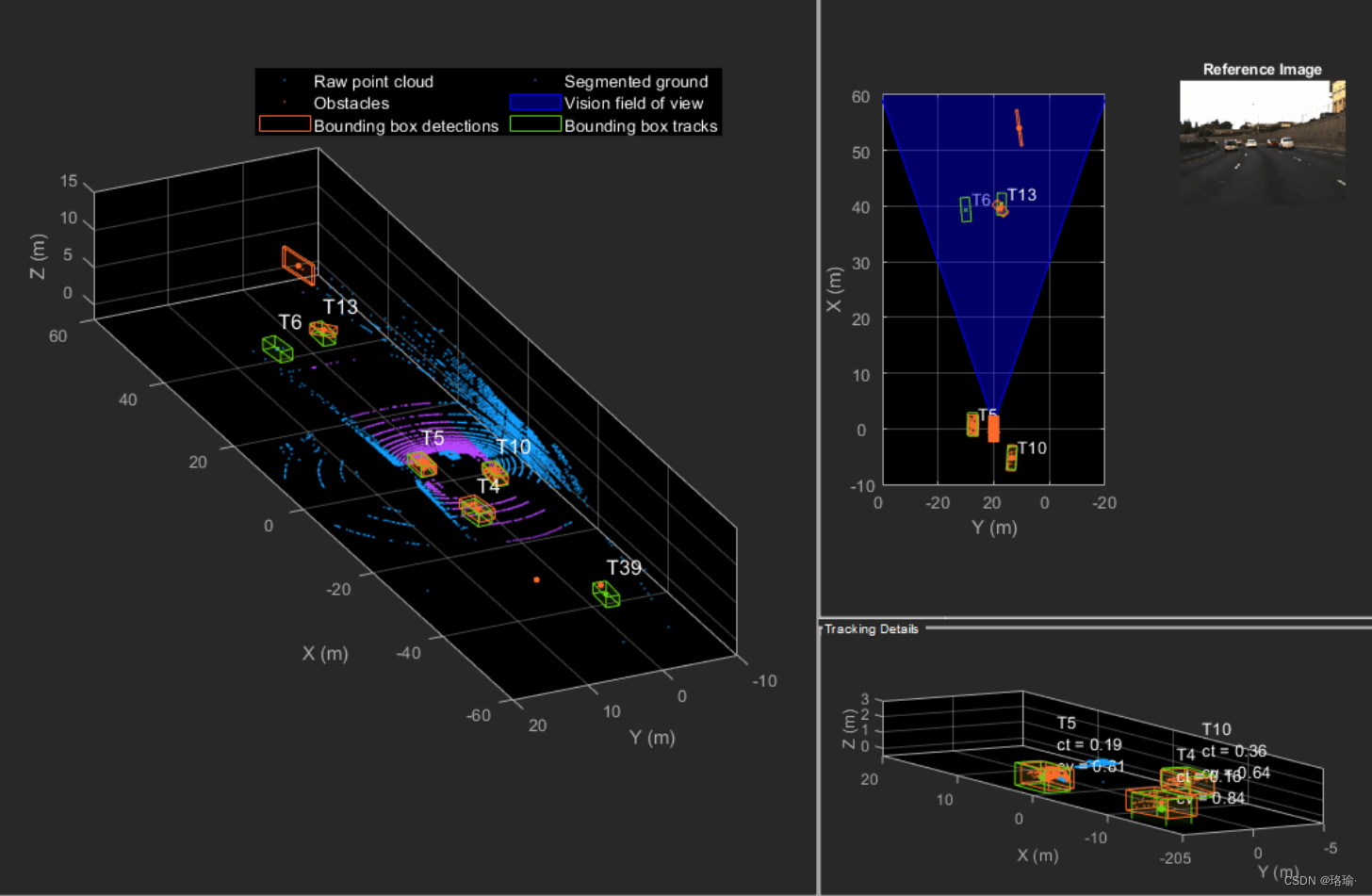 上面的动画显示了时间 = 3 秒和时间 = 16 秒之间的模拟。请注意,T10 和 T6 等轨道在时间跨度内保持其 ID 和轨迹。但是,轨道T9丢失,因为跟踪的车辆被传感器长时间错过(未检测到)。另外,请注意,被跟踪的物体能够通过将检测定位到车辆的可见部分来保持其形状和运动学中心。例如,当轨道 T7 向前移动时,边界框检测开始落在其可见的后部,并且轨道保持车辆的实际大小。这说明了在测量函数中建模的偏移和收缩效应。