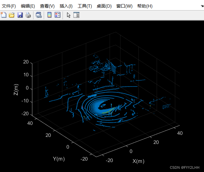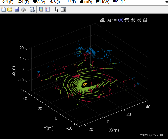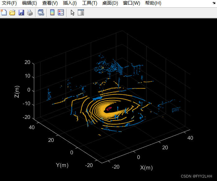 为了从激光雷达数据中识别障碍物,首先使用segmentGroundFromLidarData函数对地面进行分段,从有组织的激光雷达数据中分割出属于地平面的点。